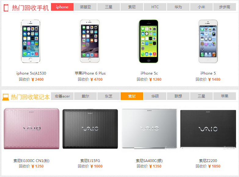 创资源网网首页热门回收机型展示